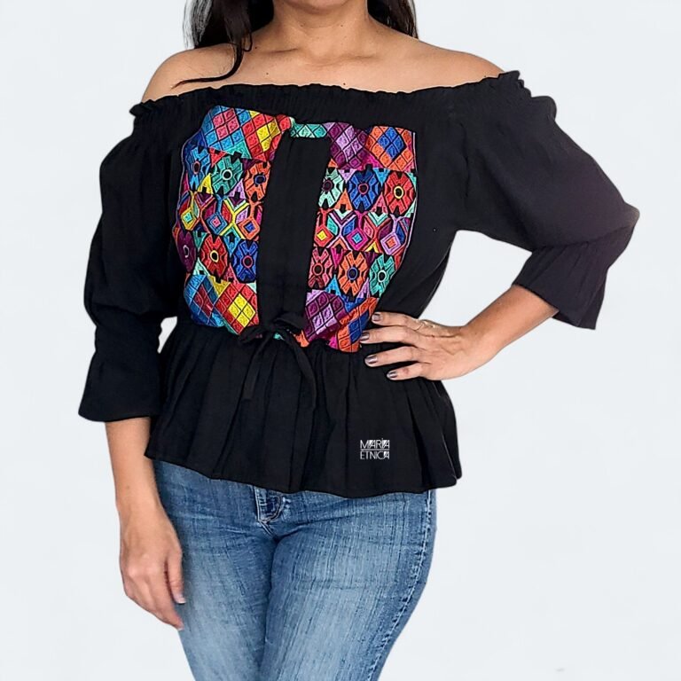 El diseño tipo campesina permite usarla con los hombros descubiertos, mientras que el detalle de encaje en el escote agrega un aire romántico y tradicional. Se adapta fácilmente a cualquier estilo y puede combinarse con jeans, faldas o pantalones de lino.