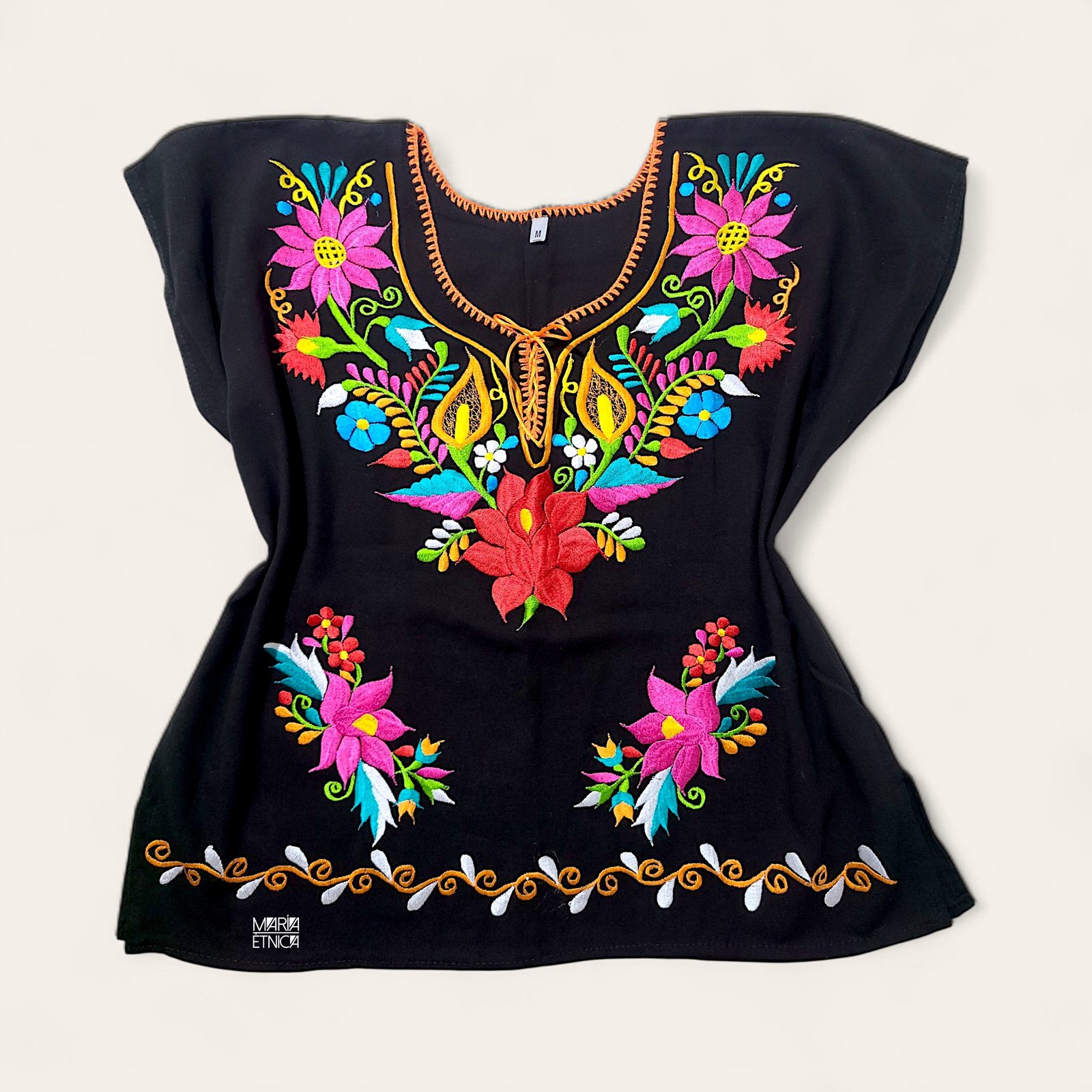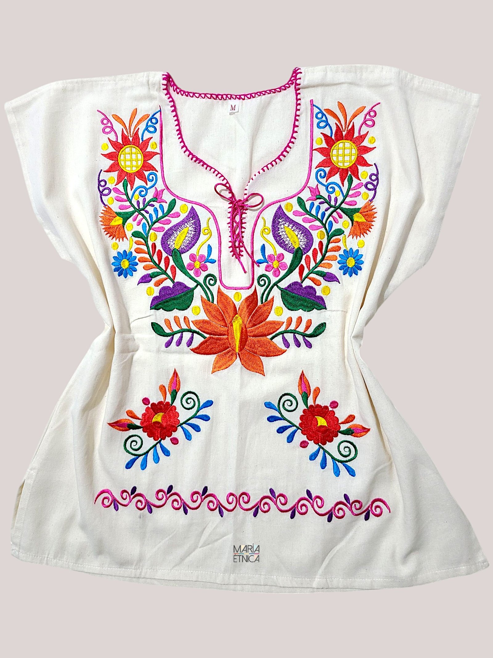 La Blusa Estela es una explosión de color y cultura mexicana. Su bordado vibrante, lleno de flores, hojas y aves, es elaborado con gran detalle. Su corte tipo kimono la hace cómoda, fresca y perfecta para todo tipo de cuerpo.